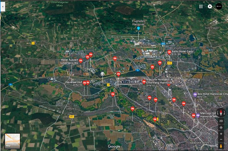 Ганновер, завод Johnson Controls, обозначен серым знаком. Красными и фиолетовыми значками отмечены гостиницы. 200 метров до реки, 500 м до жилых домов