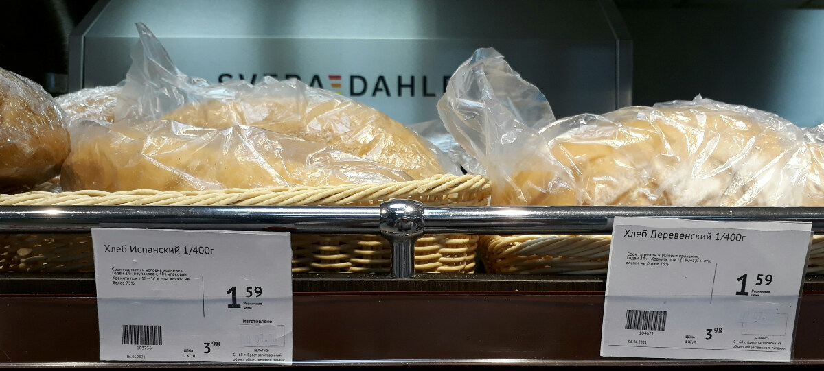 Хлеб встречается в украинских чеках дважды: по-видимому, Краковский (600 г) за 14,95 грн. (1,39 руб.) и бездрожжевой без указания веса за 19,9 грн. (1,84 руб.). Поискали в Бресте приблизительные аналоги.