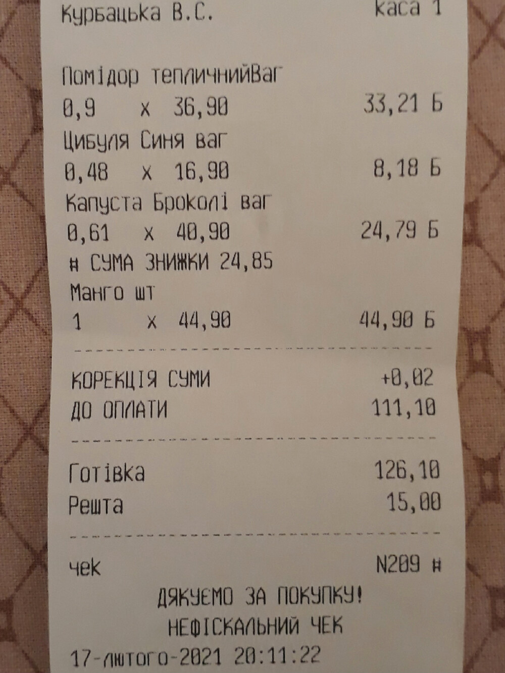 Судя по последнему чеку, наша героиня, видимо, в тоске по родине, не удержалась и купила молодую картошку. Она стоила в феврале со скидкой 26,5 грн. (2,46 руб.) за килограмм.