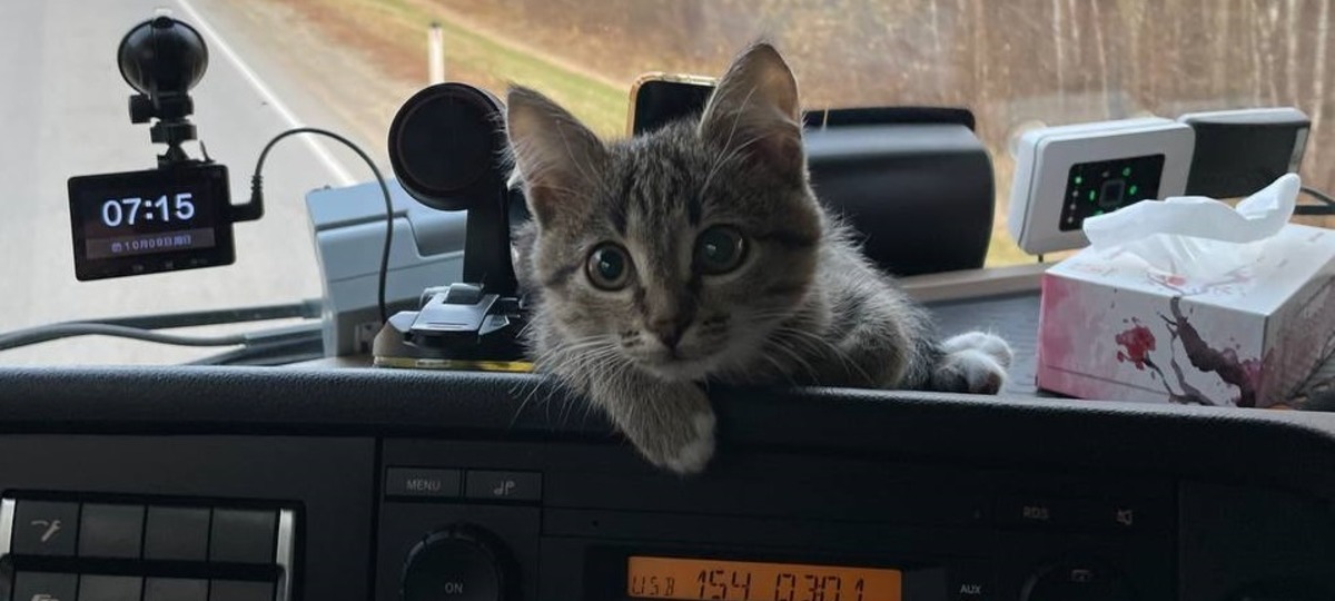 Жителю Барановичей Виталию Коновалику 36 лет. В середине сентября, находясь в очередном рейсе где-то между Уфой и Челябинском, он случайно увидел на заправке худую, ужасно голодную маленькую кошечку. Он пожалел ее, взяв с собой.
