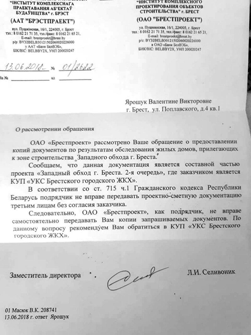 Чтобы получить экспертные заключения на собственные дома, горожане сначала устно, а затем и письменно обратились в «Брестпроект», на что получили ответ: «данная документация является составной частью проекта «Западный обход г. Бреста. 2-я очередь»», где заказчик — КУП «УКС Брестского городского ЖКХ». Подрядчик «не вправе передавать проектно-сметную документацию третьим лицам без согласия заказчика».