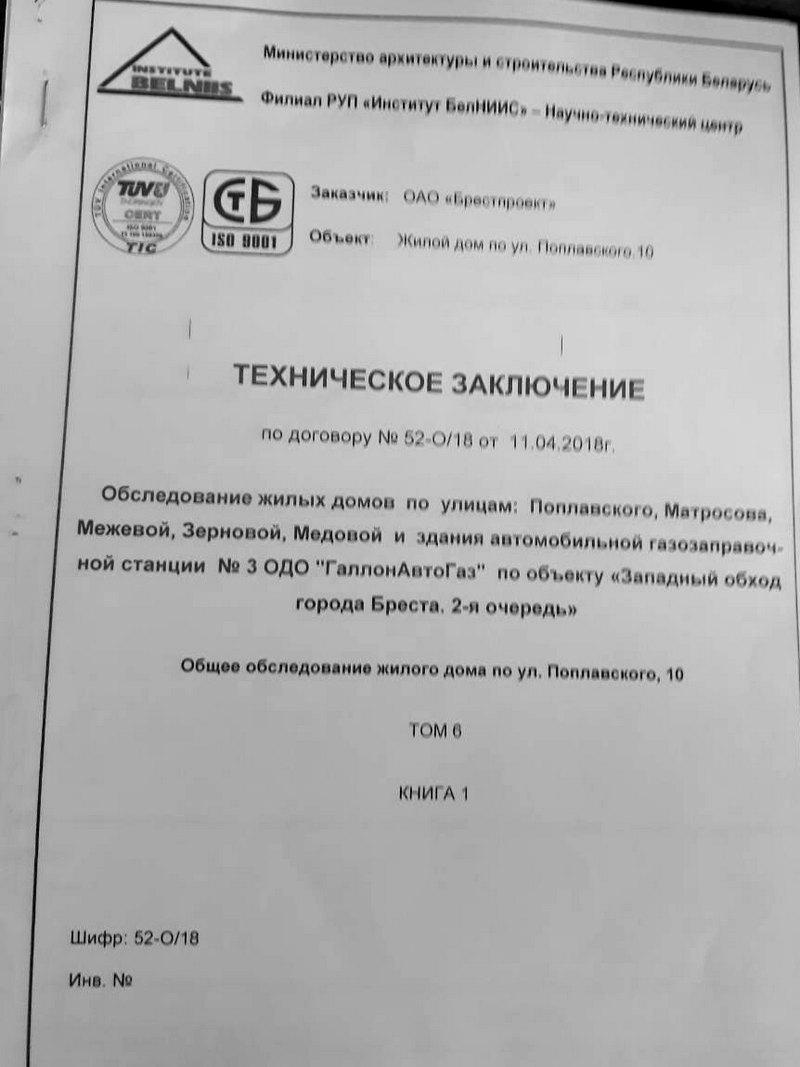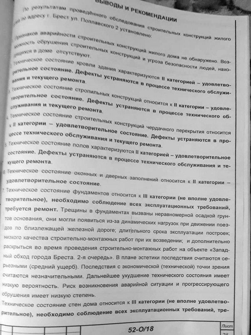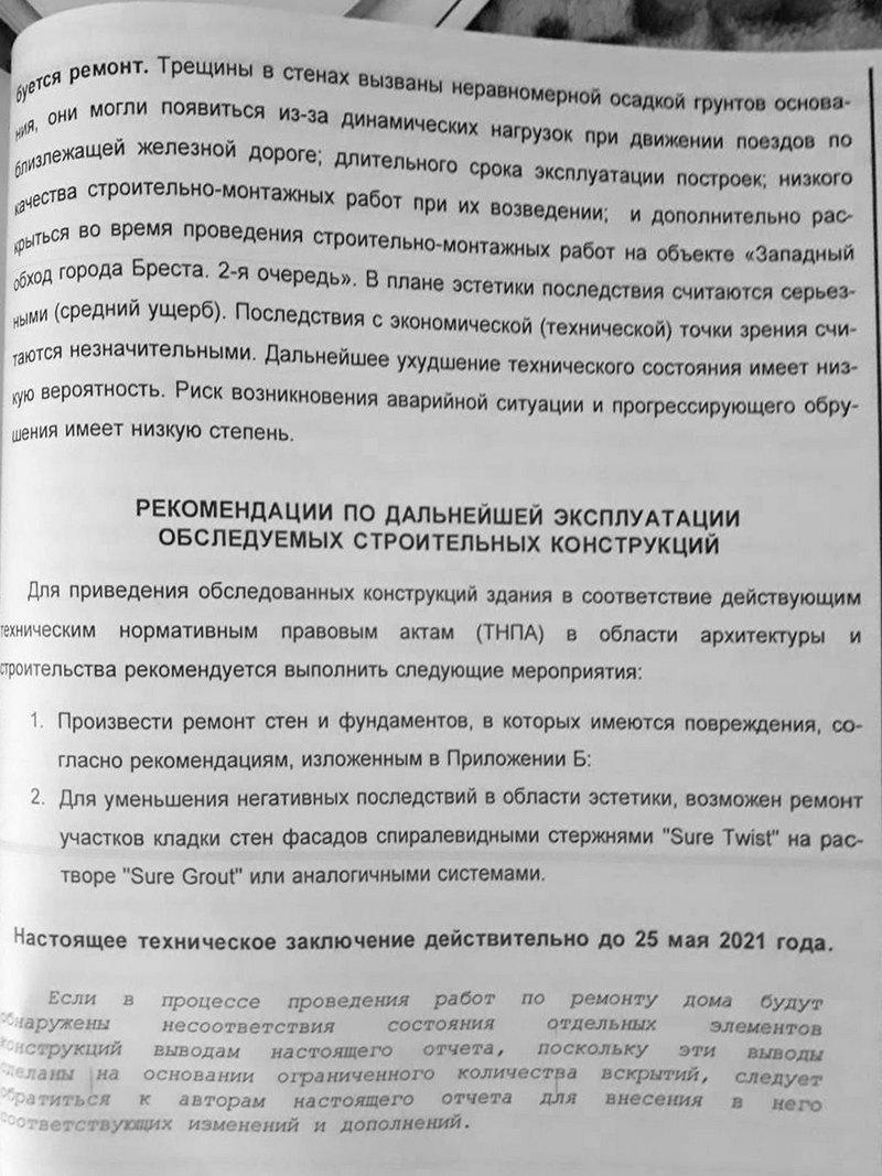 Выдержка из заключения экспертизы: «Трещины в стенах вызваны неравномерной осадкой грунтов основания, они могли появиться из-за динамических нагрузок при движении поездов по близлежащей железной дороге; длительного срока эксплуатации построек; низкого качества строительно-монтажных работ при их возведении; и дополнительно раскрыться во время проведения строительно-монтажных работ на объекте «Западный обход г. Бреста. 2-я очередь».