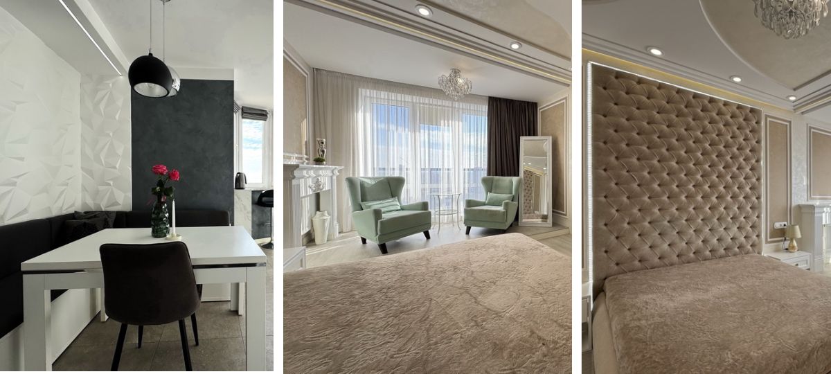 Стильная «двушка» находится в Бресте в доме по улице Октябрьской Революции. В ней две отдельные комнаты, кухня и раздельный санузел. Комнаты напоминают современный будуар — бархатное изголовье кровати, аксессуары, высокие потолки и претенциозные люстры. Но за счет нейтральной светлой гаммы и сдержанного стиля предметов мебели интерьер выглядит современно и неизбито.