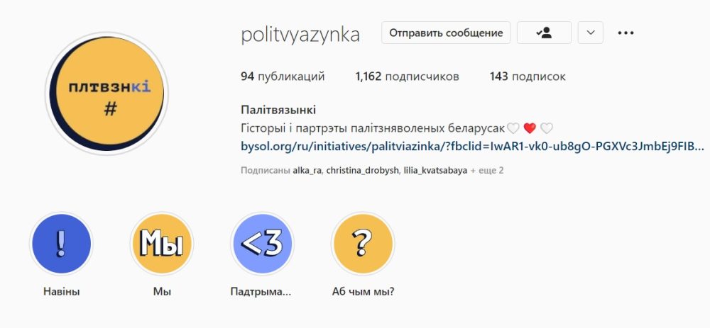 Беларусы создают много проектов, которые помогают политзаключенным и рассказывают о них всему миру. Один из них — сайт и страница в Instagram «Политвязынки». Здесь с помощью портретов и небольших текстов рассказывают истории политзаключенных женщин. Над ним работают беларуская журналистка Евгения Долгая и художница Анна Татур, которая учится в художественной школе во французском Дюнкерке.