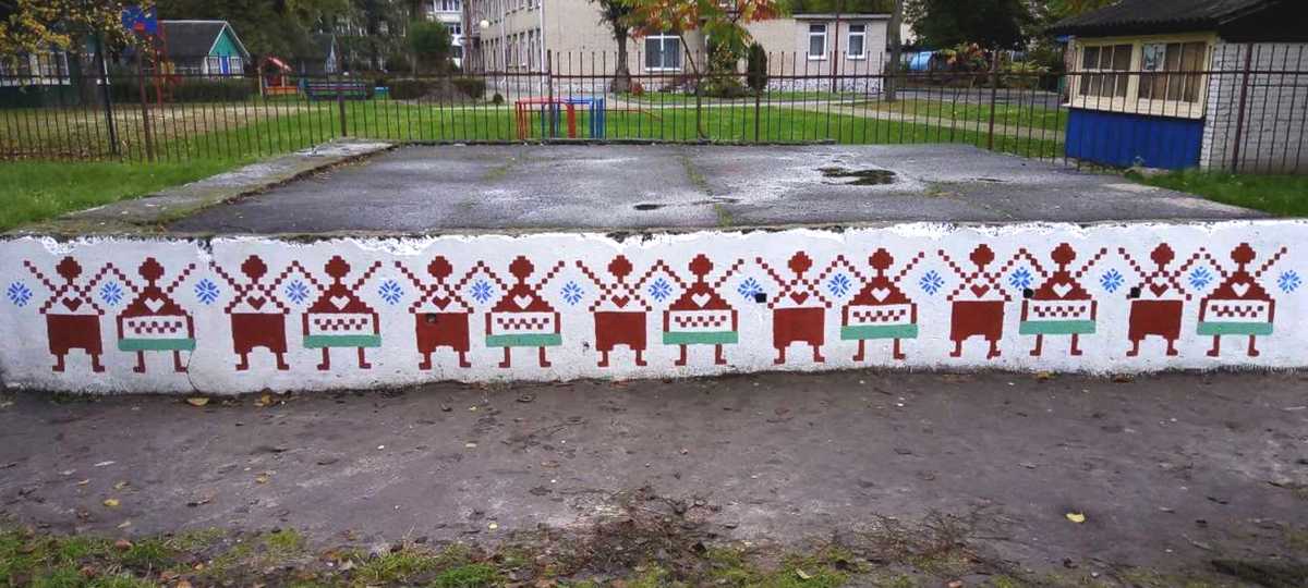Орнамент был разработан художником и наносился посредством трафарета. В итоге получилось симпатично: орнамент красного цвета с голубыми василечками на белом фоне, а на стороне, прилегающей к Социально-педагогическому центру – мультяшные коты, чтобы было интересно детям.