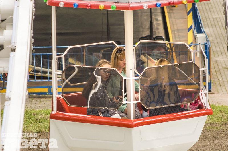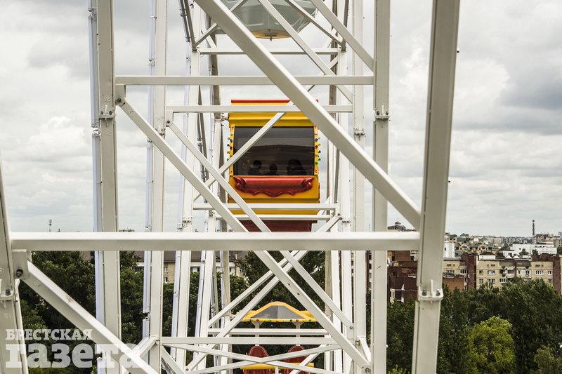 Валентина выбрала так называемую экстремальную кабинку. Ее суть в том, что никаких ограждений нет. Пассажиров фиксируют удерживающим устройством. Наша коллега боится высоты, поэтому ей казалось, что на аттракционе будет страшно. Оказалось, что не очень. В кабинке было не очень удобно. Если пассажир невысокого роста, то его ноги могут просто висеть. Поставить их сразу на специальную подставку коллега не догадалась. К тому же между ног на сидении проходит перекладина, что не обрадует девушек в мини. Что касается обзора, то видно было не очень хорошо. Валентина сидела спиной к Брестской крепости. Она повернулась, чтобы ее рассмотреть, но увидеть удалось только мост рядом с крепостью. Повернуться больше не позволили крепление и спинка сидения.