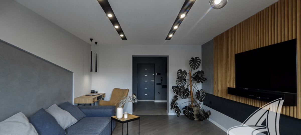 У квартиры свой стиль: монохромные оттенки серого и синего, а также четкие геометрические линии и фигуры придают пространству объем. В помещениях много глянцевых акриловых и стеклянных поверхностей, а также большое количество светильников. Строгая «официальность» обстановки нивелирована теплотой натурального дерева. В декоративной конструкции из деревянных реек находится скрытое крепление для телевизора.