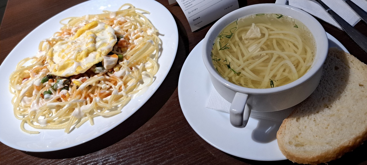 Бульон в этом ресторанчике всегда вкусный, наваристый. Паста довольно простая, «народная». Овощи как из замороженного ассорти, мяса немного. В бульоне, может быть, даже побольше. Соуса, наоборот, многовато, но это обычная львовская история: здесь все любят поливать от души. Однажды меня угораздило на рождественском базарчике взять венские вафли с шоколадом, и это был мем про «ожидание-реальность», только наоборот. Если на вывеске красовались вафли, политые тонкой струйкой шоколада, то в мою порцию просто бахнули полный черпак. Пуховик потом пришлось отстирывать.