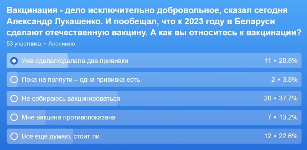 В “Одноклассниках” антипрививочников среди наших читателей оказалось куда больше: 37,7% (20 из 53 участников опроса). Думающих над вакцинацией и вакцинированных получилось примерно поровну: 22,6% и 20,8% соответственно.