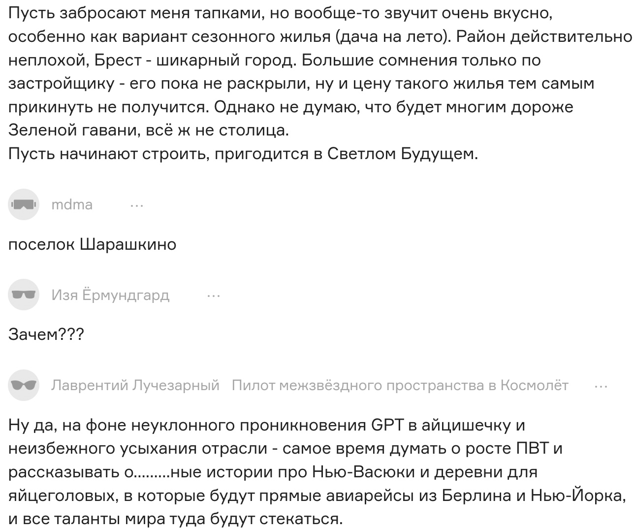 Под статьей на сайте DEV.by уже успели отреагировать на амбициозную идею главы города-спутника Бреста. Например, пользователь под ником fallinmyhand назвал будущий проект «первой исправительной колонией для айтишников», а читатель под ником testusername задался вопросом «это и есть – жесткое перетряхивание ПВТ? Из Новой Боровой – в деревню под Брестом?». Пользователь Сергей Гончаренко и вовсе оставил комментарий в духе беларуских реалий: «По периметру участка надо поставить тройной забор из колючей проволоки под напряжением (вот и АЭС пригодилась) и вышки с пулеметами, чтобы жителей деревни ничто не отвлекало от выполнения дневной нормы. Ну и братский колумбарий для выгоревших».