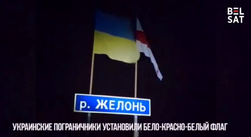 В видео также показали БЧБ-флаг, который украинцы вывесили на границе с Беларусью. Судя по кадрам, он находится рядом с рекой Желонь. Если открыть гугл-карты и посмотреть, где находится река Желонь, то можно предположить, что проектор установили в пункте пропуска «Выступовичи» (с беларуской стороны — пункт пропуска «Новая Рудня»).