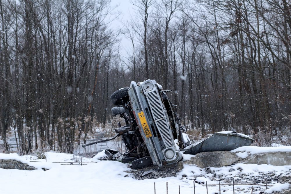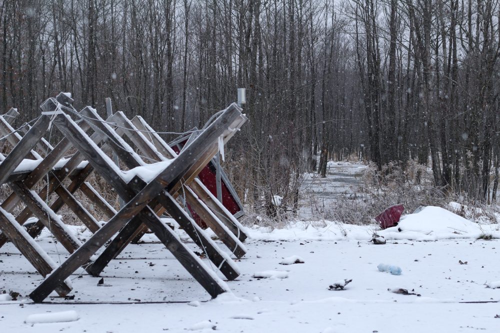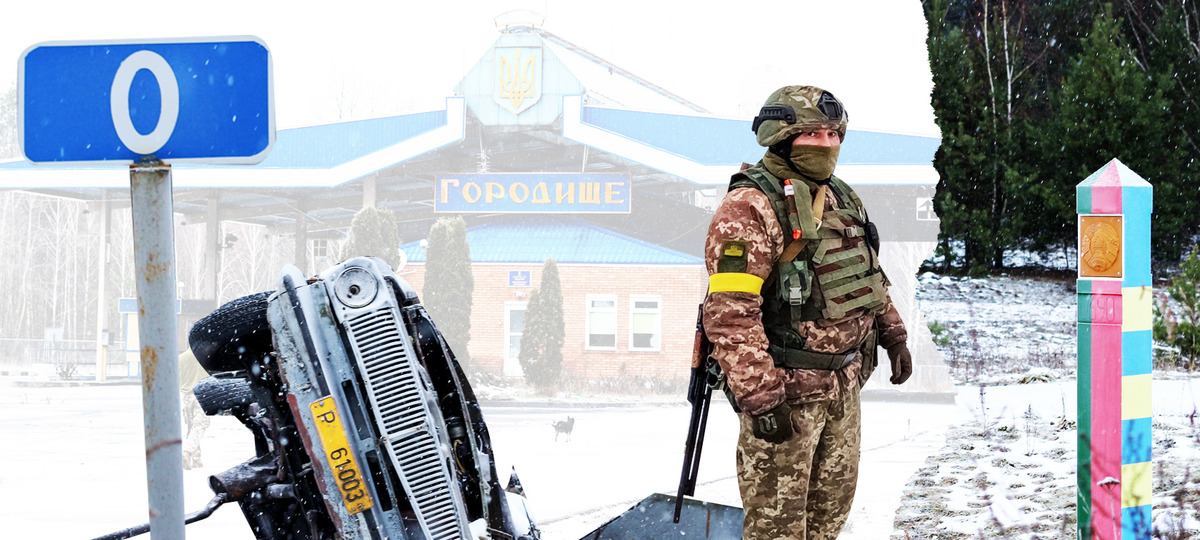 «Чтобы подойти поближе к беларускому пограничному пункту, придется обойти несколько рвов и баррикад, перелезть через изгороди, не наступив на шипы в асфальте. Пройтись гуськом за пограничниками заминированной дорогой. На обочине увидеть перевернутую вверх дном покореженную машину — она тоже была заминирована, взорвалась от молнии. И оказаться метрах в 200 от беларуского пункта», — пишет УП.