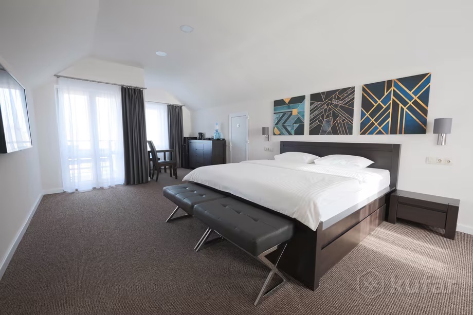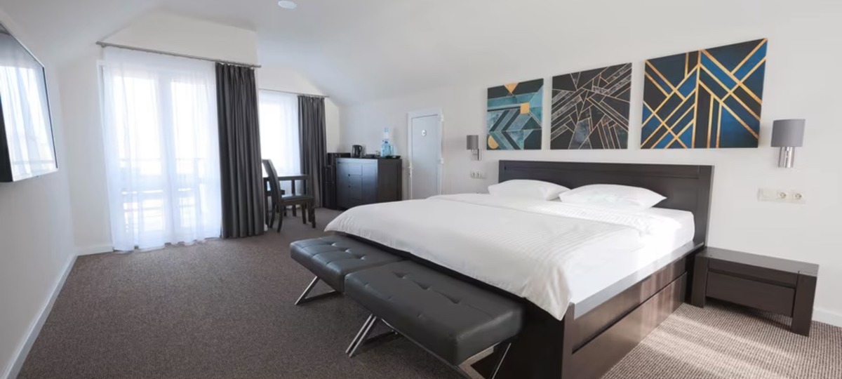 «Люкс с видом на озеро» – гласит объявление. Апартаменты находятся в коттедже, на окраине города. В квартире есть большая двуспальная кровать king-size с ортопедическим матрасом, собственный санузел, мини-кухня с холодильником, СВЧ и электрочайник.