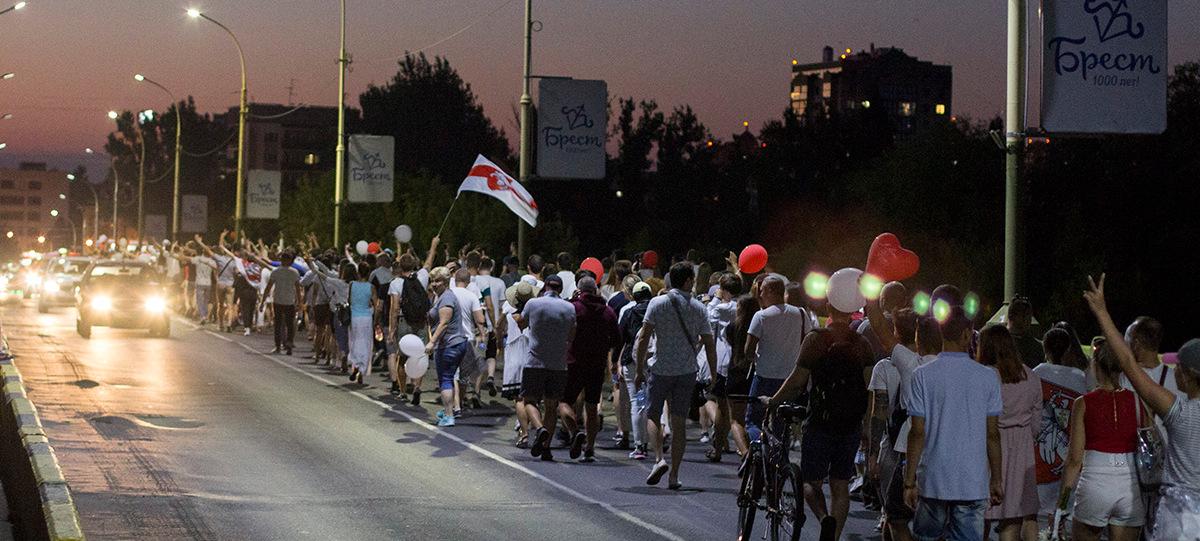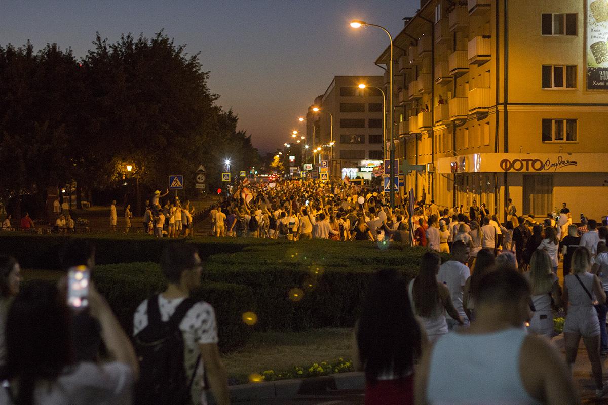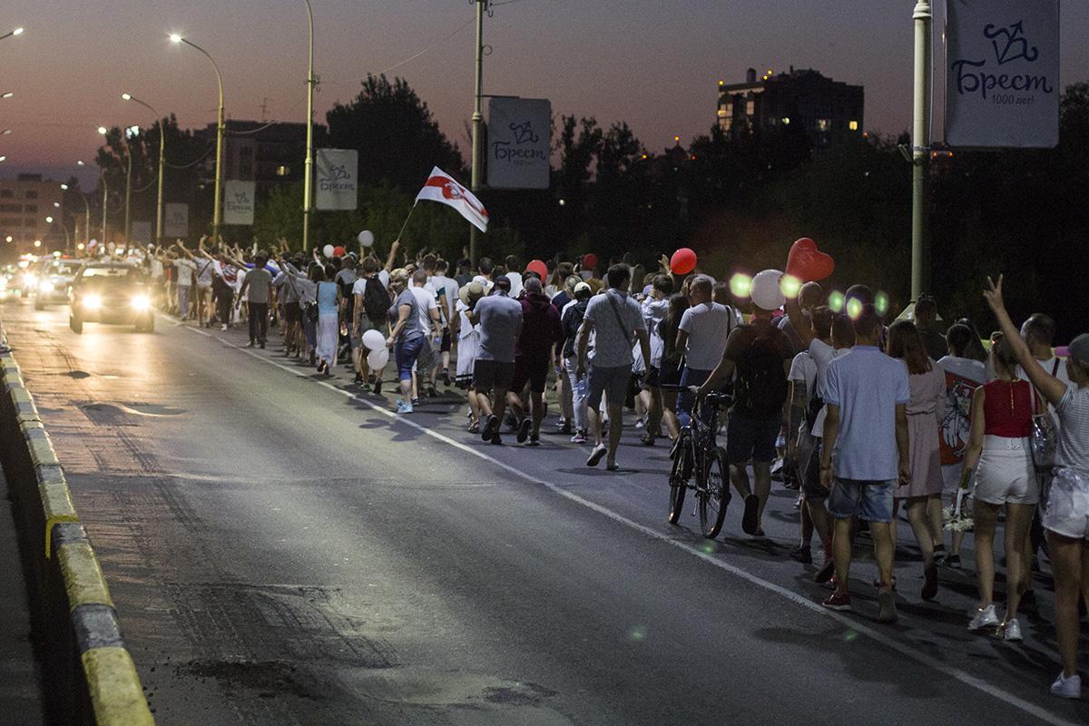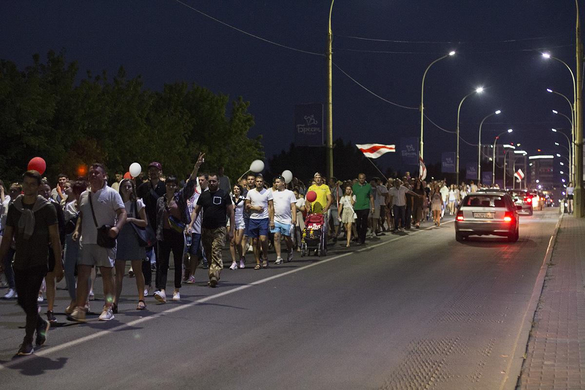 Затем протестующие с Пушкинской объединились с колонной на улице Ленина и пошли по центру города. Они вышли на проспект Машерова, перешли Кобринский мост и двинулись дальше по Московской. Люди шли по тротуару и двум полосам дороги. Проезжающие мимо автомобили им сигналили, демонстранты в ответ хлопали.