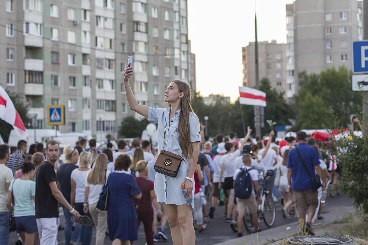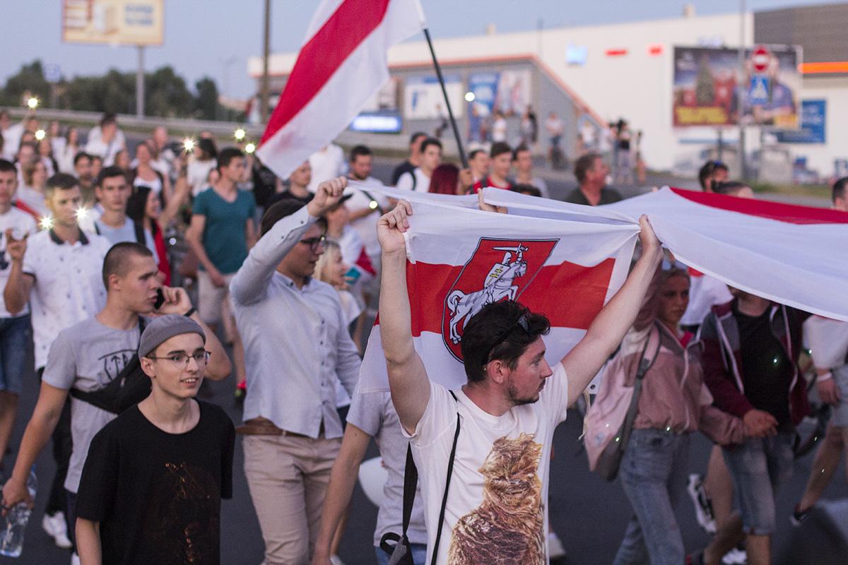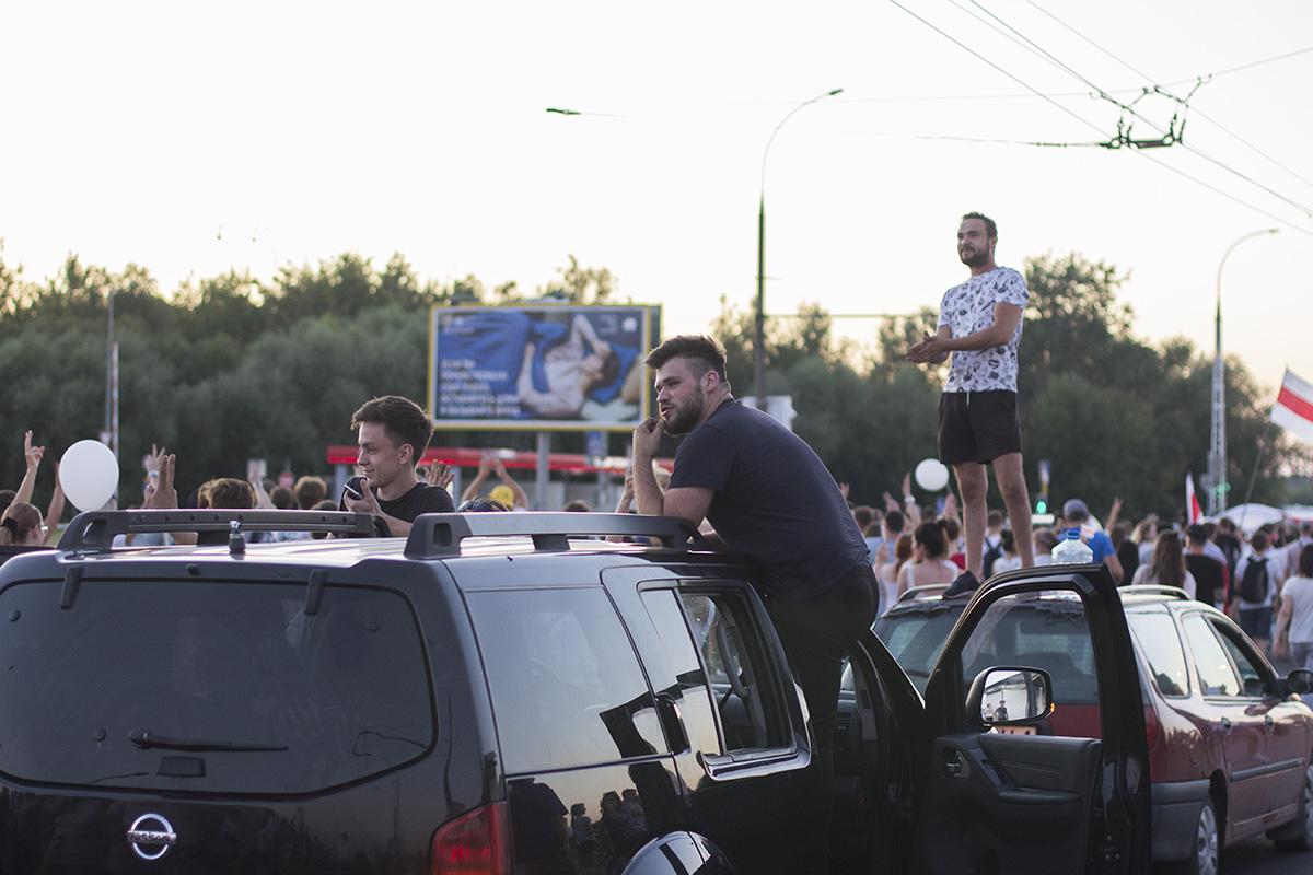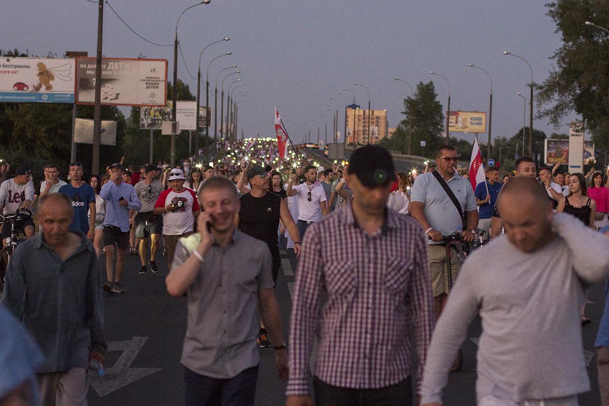Затем протестующие с Пушкинской объединились с колонной на улице Ленина и пошли по центру города. Они вышли на проспект Машерова, перешли Кобринский мост и двинулись дальше по Московской. Люди шли по тротуару и двум полосам дороги. Проезжающие мимо автомобили им сигналили, демонстранты в ответ хлопали.