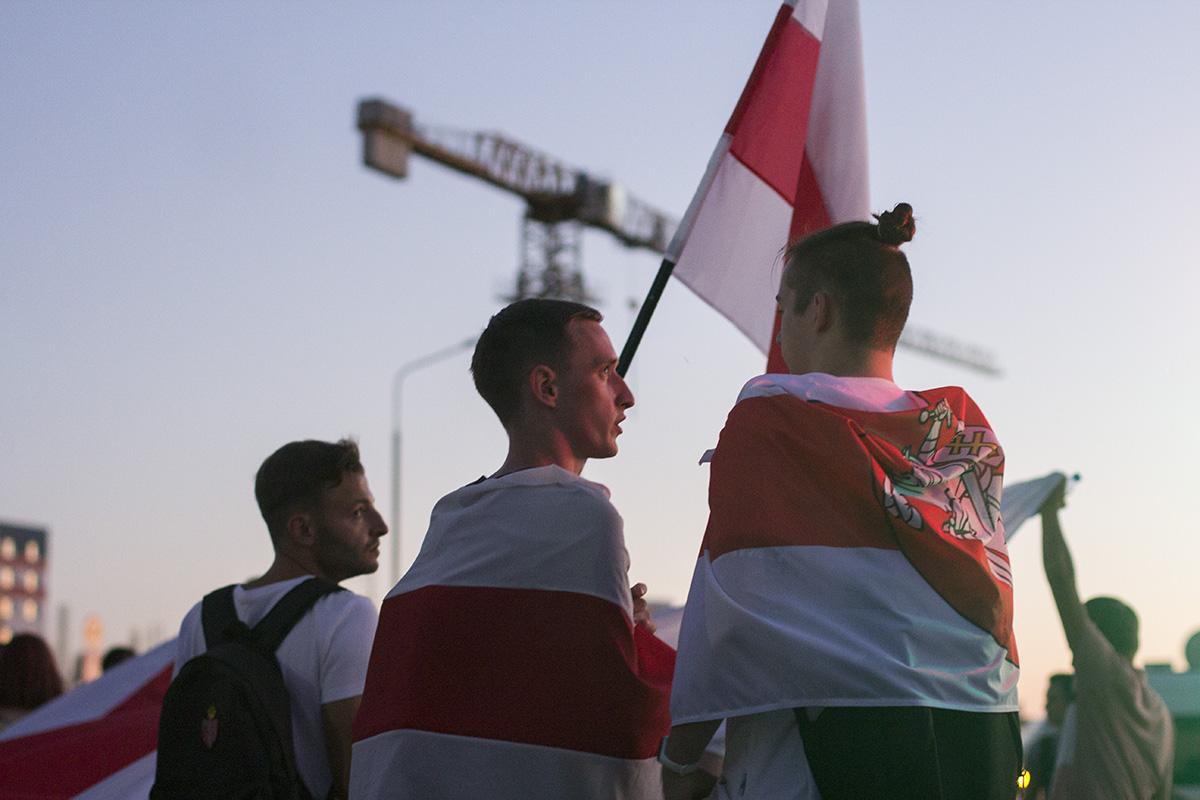 Люди, которые собрались перед заграждениями скандировали «Жыве Беларусь», «Верым, можам, пераможам». По другую сторону ограждения, помимо милиции, стояла малочисленная группа протестующих. Среди них — лидер группы «Дай Дарогу!» Юрий Стыльский, который вел стрим с места событий. Они пришли на площадь Ленина заранее, когда милиция еще не выставила турникеты, и расправили напротив облисполкома большой бело-красно-белый флаг.