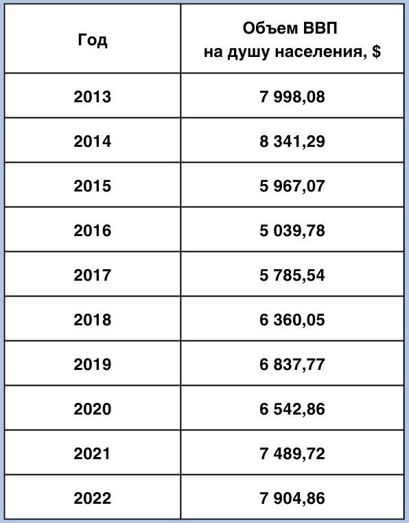 Давайте посмотрим еще на один немаловажный момент — объем ВВП на душу населения. Этот показатель демонстрирует уровень экономической активности и качество жизни людей. Чем он выше, тем больше и продуктивнее работают граждане и, соответственно, в среднем больше зарабатывают. Данные взяты с сайта Всемирного банка.