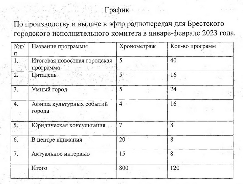 Брестский горисполком при заказе описал необходимую ему телепередачу так: «программа о работе представителей властных структур, депутатского корпуса, а также экономическом, политическом, социально-культурном развитии Бреста, въездной туризм, международное сотрудничество».