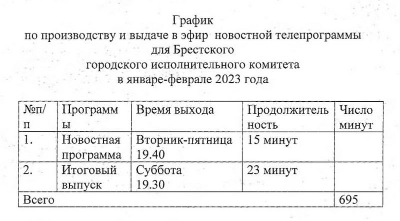 Нам не удалось точно выяснить на сайте госзакупок, какой телеканал принял заказ горисполкома, но мы предполагаем, что это «БугТВ», потому что итоговый выпуск новостей у них выходит каждую субботу, как и просили чиновники. А у ТРК «Брест» итоги выходят по воскресеньям. Да и один из документов на сайте госзакупок был подписан «БугТВ».