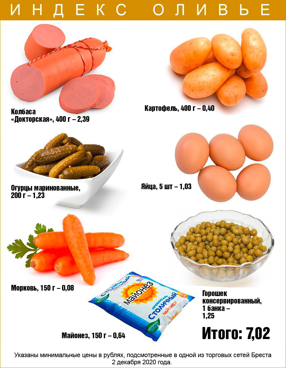 В последний раз «Брестская газета» считала индекс оливье в декабре 2020 года. У нас он получился таким: