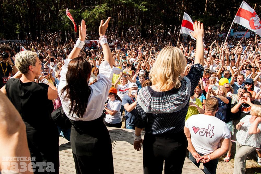 Около 15.30 Тихановская, Колесникова и Цепкало поднялись на летнюю сцену в Парке воинов-интернационалистов. Собравшиеся встретили их овациями. В такой эмоционально-восторженной атмосфере взаимопонимания и единодушия прошел весь митинг.