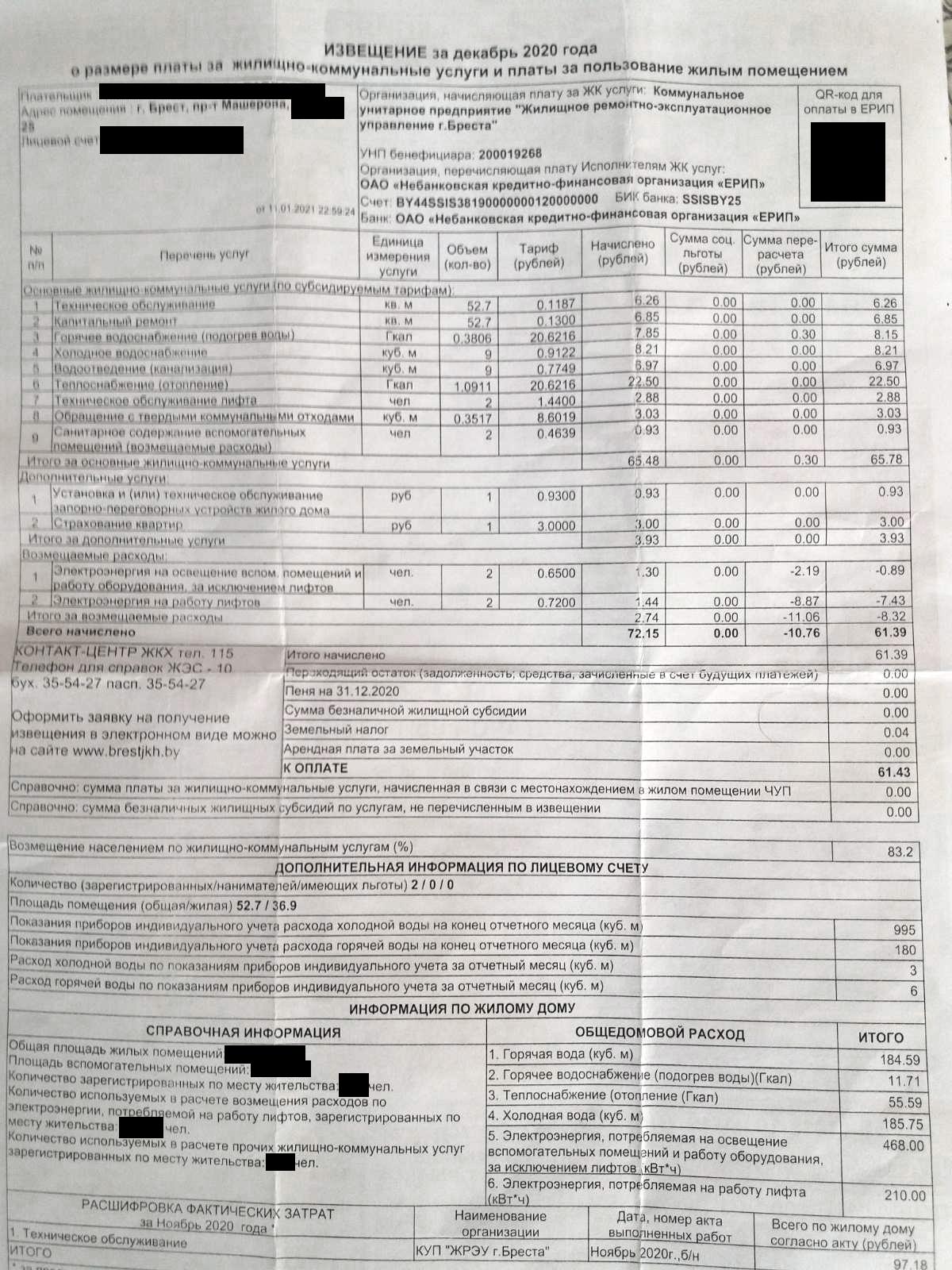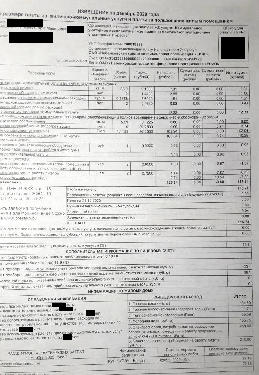 Чиновники планировали, что в 2020 году население будет возмещать 83,2% затрат на оказание ЖКУ. Этот показатель значился на жировках. Он есть и на фотографиях, которые прислали «БГ» наши читатели. На январских жировках видно, что в графе «возмещение населением по ЖКУ» стоит уже другая цифра — 82,3%. Получается, что планируемый уровень возмещения населением затрат на оказание ЖКУ на этот год ниже, чем на 2020-й, несмотря на повышение тарифов в пределах 5 долларов.