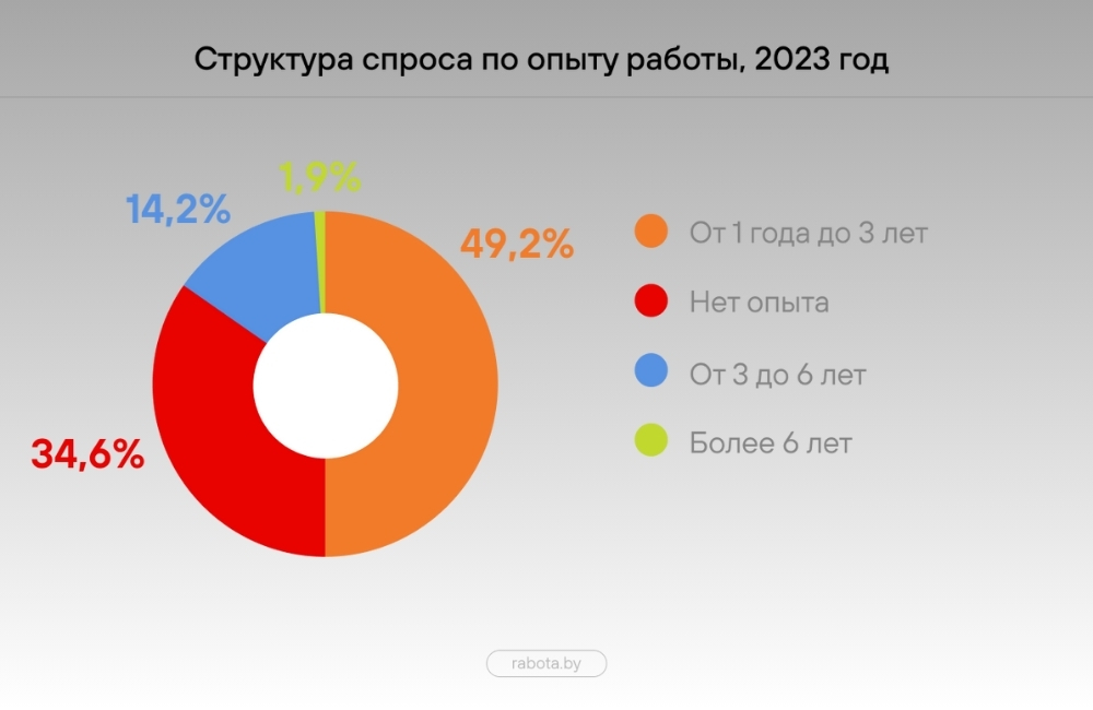 Почти в каждой второй вакансии требовался опыт от 1 года до 3 лет (49,2%). Специалисты, не имеющие опыта работы, также достаточно востребованы: для них было размещено порядка 34% вакансий от общего количества.