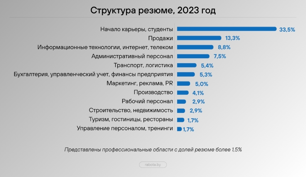 Поведение соискателей в 2023 году отличалось от позиции нанимателей: многие специалисты предпочитали занять выжидательную позицию. В структуре резюме на первом месте — студенты и специалисты без опыта работы. За ними в топе расположились специалисты из сферы продаж, информационных технологий и интернета, административного персонала, транспорта и логистики.