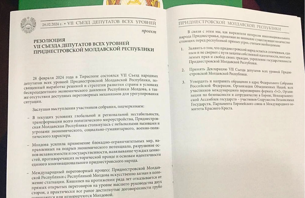 В проекте резолюции съезда так называемых депутатов непризнанной республики говорится о том, что на территории Приднестровской Молдавской Республики проживает 220 тысяч граждан России, которые нуждаются в защите «страны» в условиях усиления давления Молдовы. В проекте резолюции говорится об уникальном положительном опыте российского миротворчества на Днестре, а также статуса гаранта и посредника в переговорном процессе.