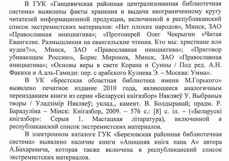 А в ГУК «Ганцевичская районная централизованная библиотечная система» хранили и выдавали читателям информационную продукцию, включенную в «Республиканский список экстремистских материалов»: