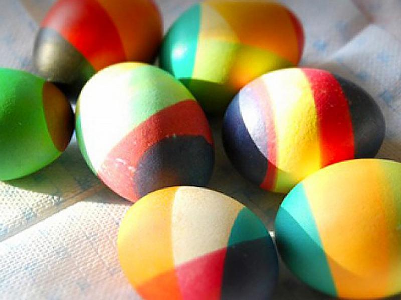 Раскрашивать яйца можно не только карандашами, но и с помощью посыпки восковой крошкой. Мелки надо натереть на мелкой терке, а потом эту крошку высыпать на горячее, только что сваренное яйцо.