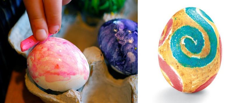 Также восковые мелки можно растопить их и окунуть туда яйцо.