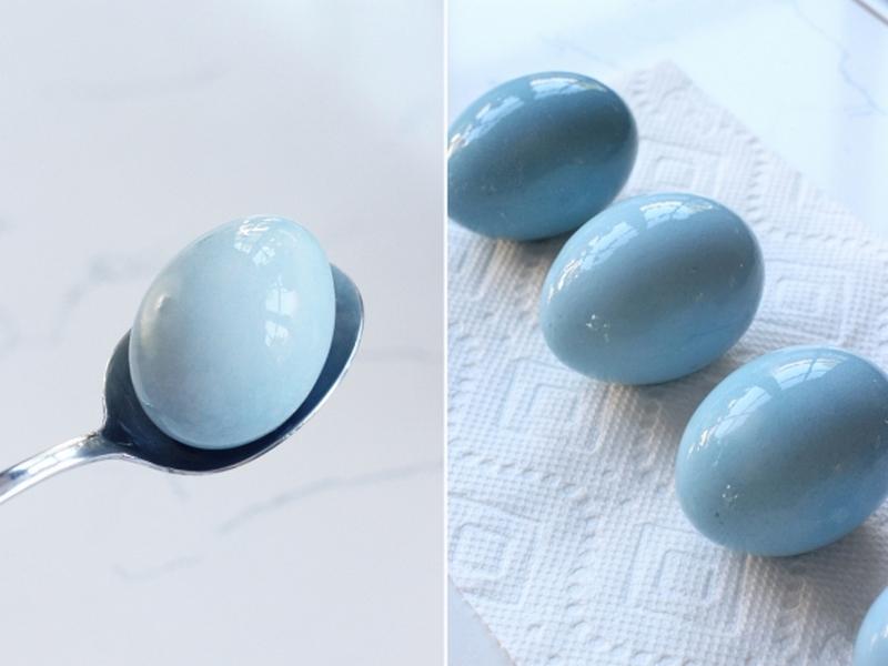 Чтобы окрасить яйца в синий, замочите в литре воды два мелко нарезанных кочана краснокочанной капусты. После этого добавьте к раствору 6 столовых ложек белого уксуса. Цвет получится насыщенным, если полученному раствору дать настояться в течение ночи. На следующий день замочите в нем на час уже сваренные яйца.