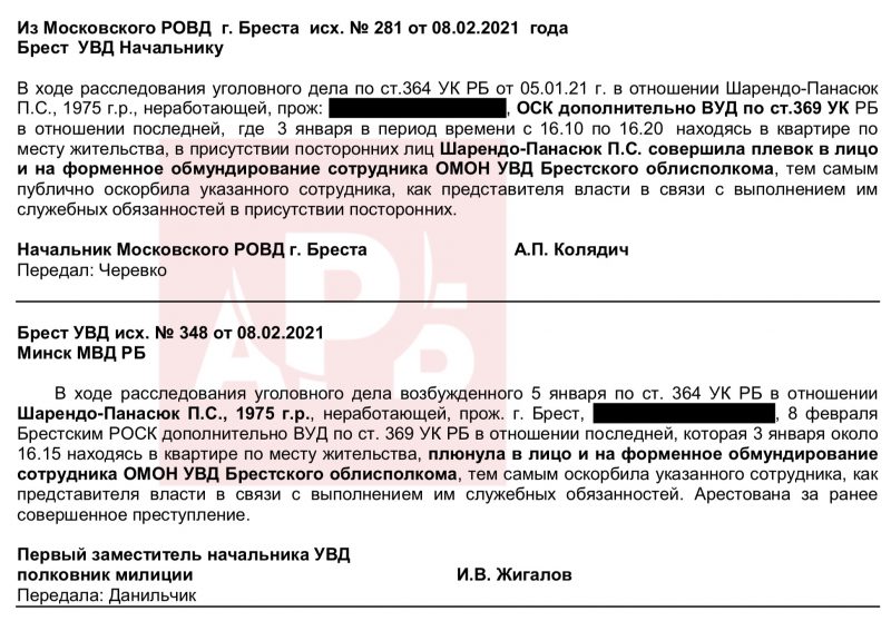 3 января 2021 года начальник Московского РОВД Бреста полковник Анатолий Колядич рапортует в областное УВД, что Шарендо-Панасюк Полина Сергеевна, находясь у себя дома, сорвала с лица участкового инспектора милиции Московского РОВД Бреста капитана милиции Рачинского А.С. медицинскую маску и поцарапала ему нос, чем причинила телесные повреждения. За это ее задержали в административном порядке по печально известной статье 23.4 КоАП РБ и поместили в ИВС Ленинского РОВД Бреста.