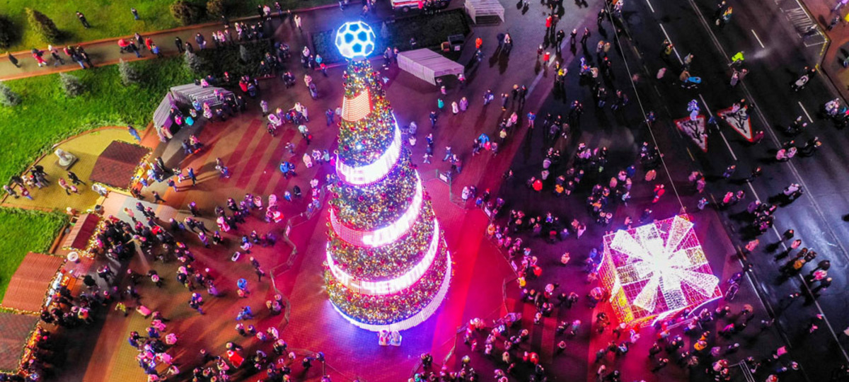 Конец 2019-го и, наверное, самая противоречивая новогодняя елка за 10 лет. Речь о ее макушке, которую украсил «бриллиант» в виде футбольного мяча. Такое специфическое украшение — в честь победы «Динамо-Брест» в чемпионате страны по футболу. На елке также появилась «бегущая строка». К слову, «бриллиант» на макушку до сих пор не вешали.