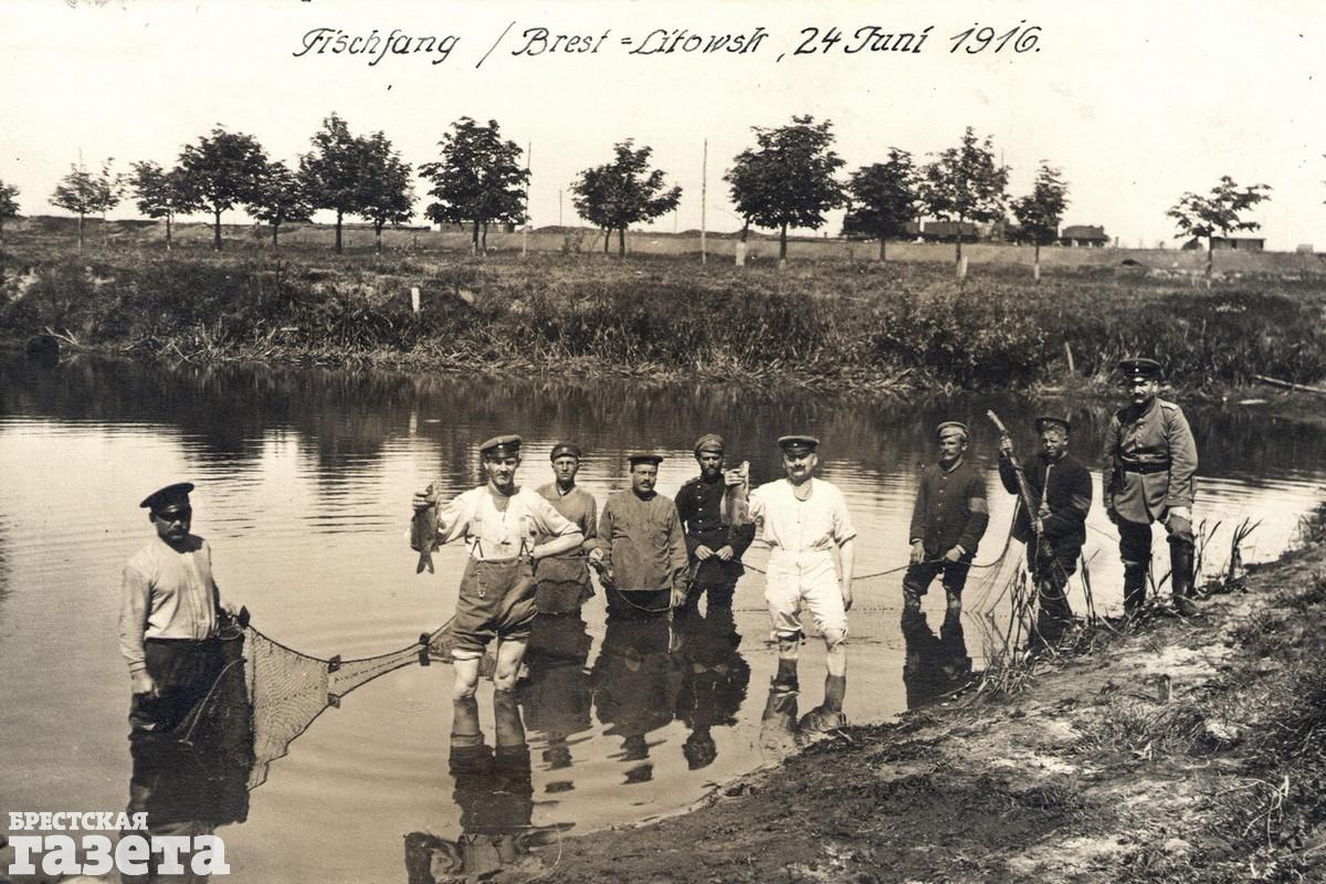 В период оккупации 1915-1918 годов рыбной ловлей в брестской акватории активно занимались кайзеровские солдаты. Для этого формировались команды по отлову рыбы из числа солдат частей, занимающихся продовольственным обеспечением. На архивном снимке, предоставленным минчанином Андреем Долговским, можно увидеть одну из таких команд. Из подписи на развороте снимка следует, что отлов рыбы проходил на «Рыбном острове» реки Мухавец в Брест-Литовске.
