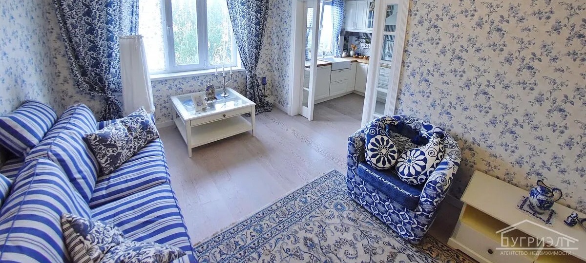 Справа от белоснежного коридора расположена гостиная. Здесь взгляду есть за что зацепиться. Прохладная бело-сине-голубая гамма, характерные аксессуары, мебель, ковер и обои – здесь явно питают слабость к русской народной росписи в технике гжель.