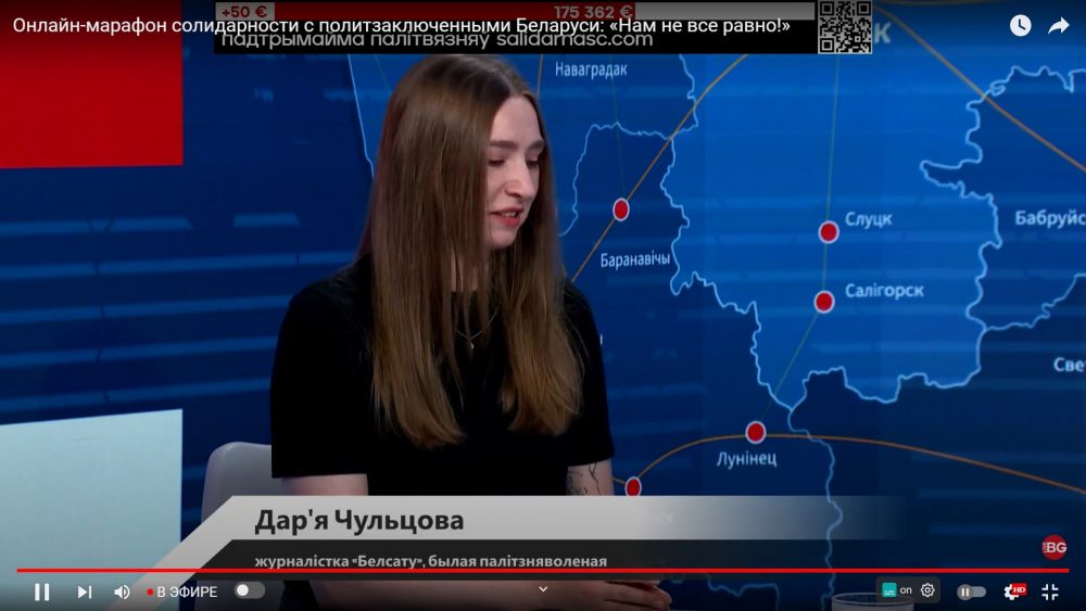 Далее в гости к «Белсату» пришла бывшая политзаключенная журналистка Дарья Чульцова. Дарья рассказала, как в колонии работает сарафанное радио. По ее мнению, политзаключенные узнают о сегодняшнем марафоне. Если узнал один политзаключенный, то по цепочке о нем узнают и остальные политзаключенные.