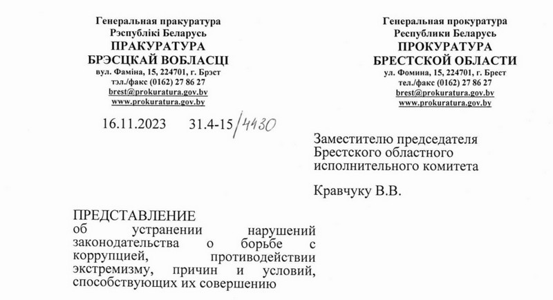 Читатели прислали редакции BGmedia копию письма Прокуратуры Брестской области заместителю председателя Брестского облисполкома Вадиму Кравчуку от 16 ноября этого года. Называется оно «Представление об устранении нарушений законодательства о борьбе с коррупцией, противодействии экстремизму, причин и условий, способствующих их совершению».