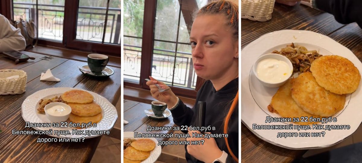 Беларуска Дарья побывала в Беловежской пуще и перекусила в местном кафе. За три драника со сметаной и жареными грибами она заплатила 22 рубля. Девушка сняла на видео блюдо и спросила у беларусов, дорого ли это за такую порцию. Ролик в TikTok набрал почти 115 тысяч просмотров и более 1 600 комментариев.