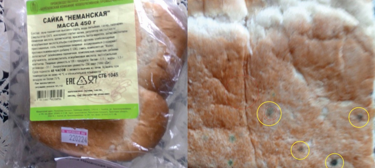 «Вот такую сайку я купил 23 февраля в магазине «Колосок», что на улице Советской в Березе. Как видно на фото, упаковка маркирована 22-м числом. Срок годности сайки — 48 часов. За ночь хлеб не мог испортиться. Следовательно, предполагаю, что сайка была давно несвежей, но, чтобы продать изделие, в магазине «поколдовали» с датой изготовления, что и ввело меня в заблуждение», — написал недовольный клиент магазине «Колосок».