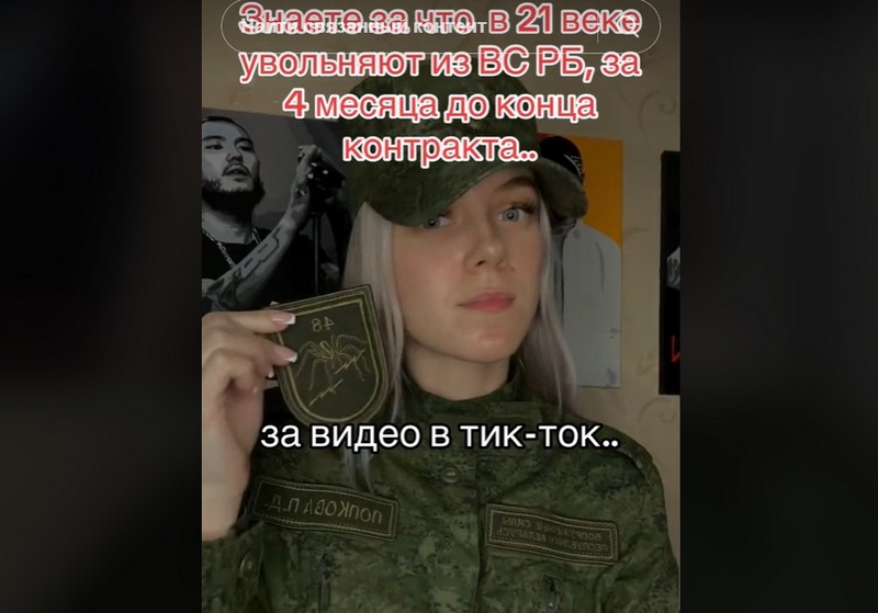 Полина Попкова (в TikTok блогерша _poli_k_ і) до недавнего времени служила в 48-м отдельном батальоне радиоэлектронной борьбы в Бресте. Всего в Вооруженных силах Полина отработала почти пять лет (уволили ее за 3 месяца и 13 дней до окончания контракта). Первые два с половиной года она служила в 10-м отдельном батальоне радиоэлектронной борьбы в Борисове. Девушка делилась в соцсетях, что это была ее детская мечта.