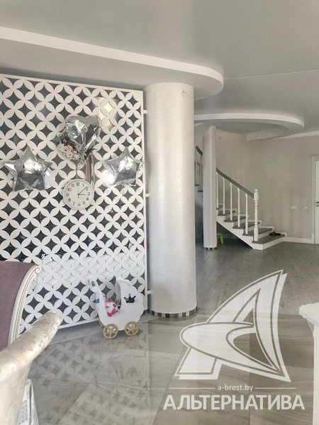 Подсвеченная лестница ведет на второй этаж, где расположены три жилые комнаты, ванная и второй санузел.