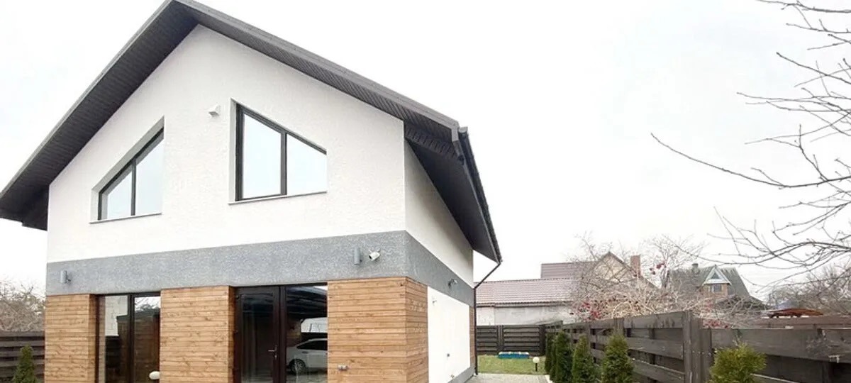 Двухэтажный коттедж с системой «умный дом» 2021 года постройки находится в микрорайоне «Красный Двор». С виду дом выглядит как обычный современный коттедж. Вокруг ухоженная территория — плитка, газон на заднем дворе, туи по периметру и фонарики. Интерес вызывает деревянная отделка фасада по нижней части дома. Выглядит свежо и оригинально.