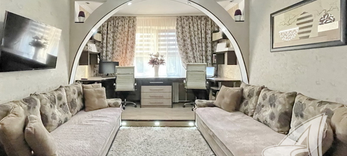 Уже из коридора заметна нестандартная планировка зала. Первое, на что обращаешь внимание, – огромная арка с нишами, которая придает пространству инопланетный вид и делит комнату на две части. С одной стороны есть зона отдыха с диванами и телевизором, с другой – рабочий кабинет.