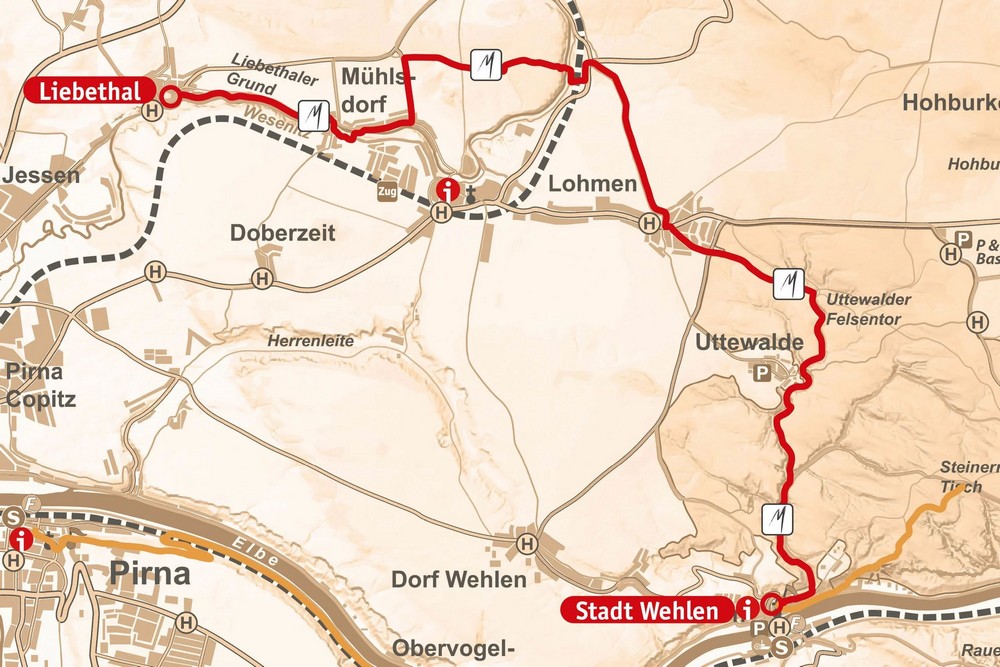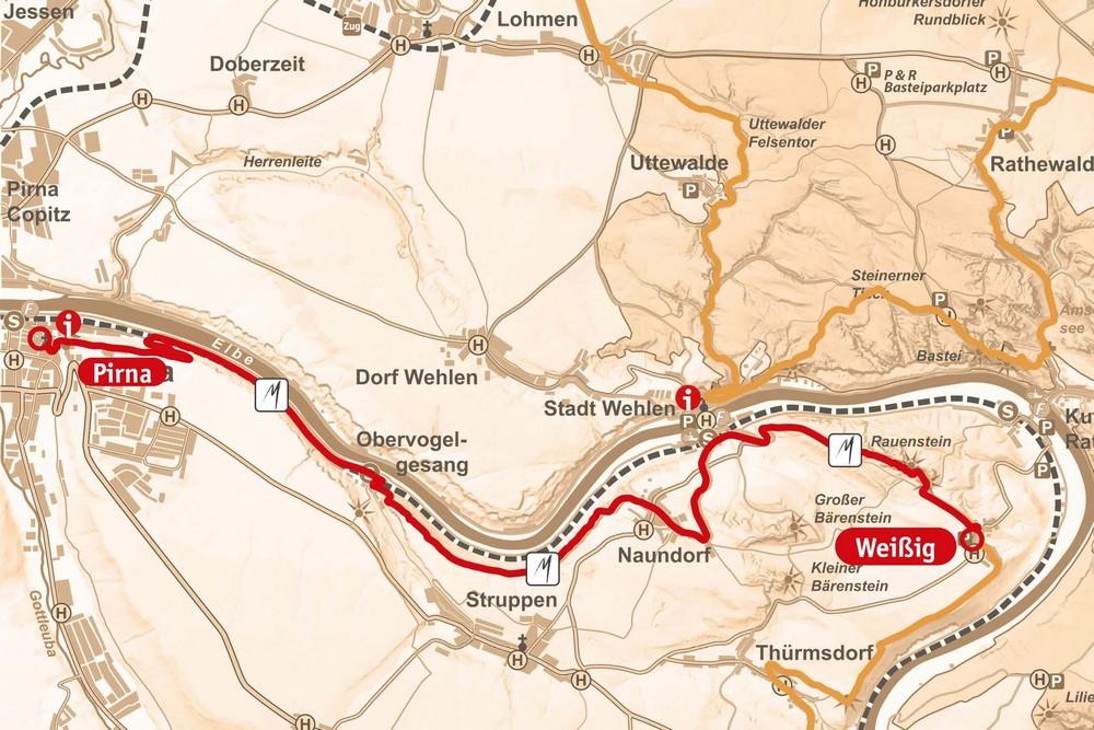 От остановки скоростной железной дороги в деревне Оберфогельгесанг вы продолжите движение по велосипедной дорожке и обычной тропе до города Пирна. Конечный пункт назначения — дом Каналетто на Рыночной площади. Здесь находится пункт туристической информации, где вы можете предъявить проштампованный пропуск Malerweg Trail Pass и получить сертификат о прохождении Малервег.