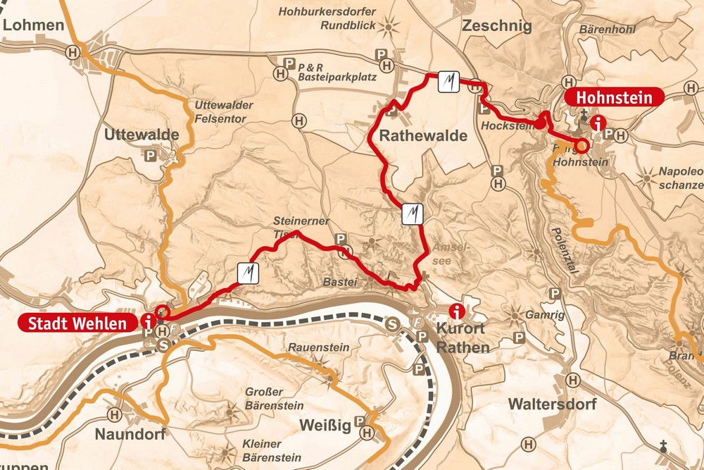 Затем Малервег продолжается по Фремденвег («Тропа незнакомцев») до знаменитого моста Бастай в скалах. Рекомендуем задержаться там на несколько часов, погулять по мосту и старинной скальной крепости, полюбоваться видом на Эльбу и поезда, которые едут вдоль реки.