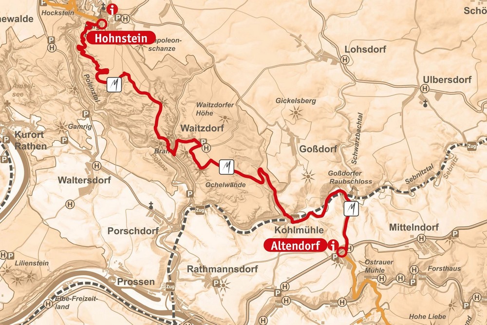 Из общины Гориш вы дойдете до деревни Пфаффендорф и одноименной столовой горы. На этом участке тропа местами узкая и крутая, проходит по деревянным и железным лестницам. Дальше вы дойдете до города Кёнигштайн, минуя городскую церковь и подножия крепости Кёнигштайн.