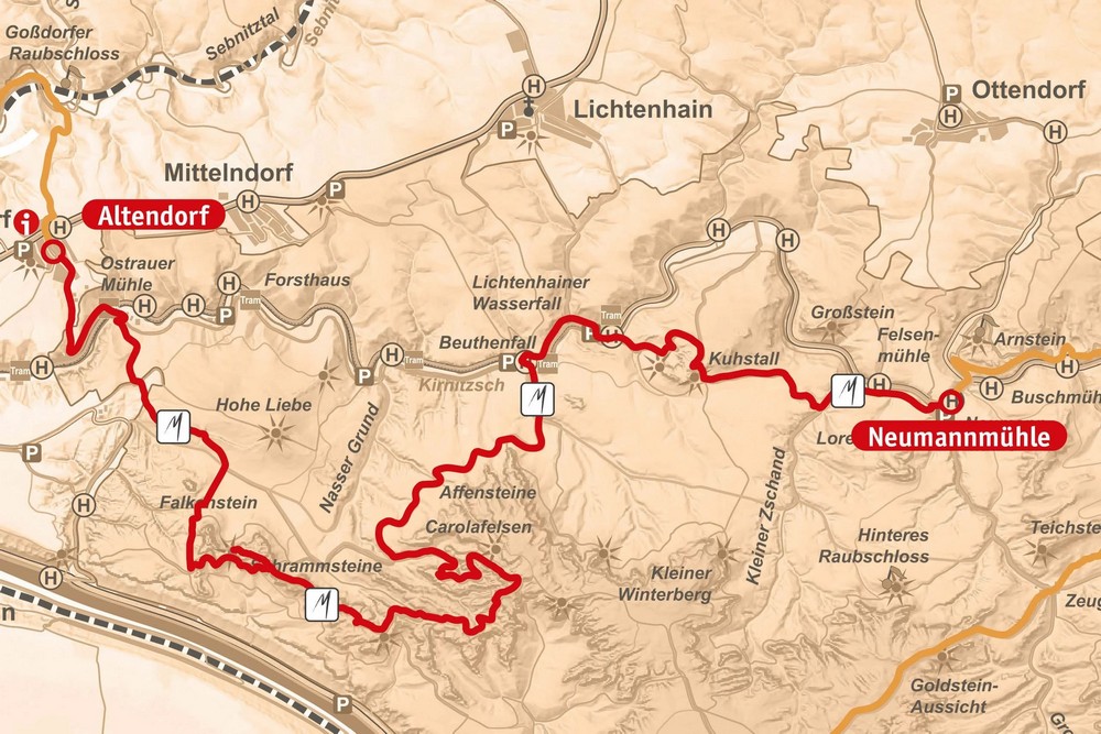 После этого на пути вы встретите «Песчаную яму», водопад и конечную остановку трамвая. Потом предстоит подняться на еще одну гору, которая ведет к скальной пещере Кухсталл на горе Нойер-Вильденштайн. Конечная точка этапа — мельница Нойманмюле, которая сейчас является техническим памятником.