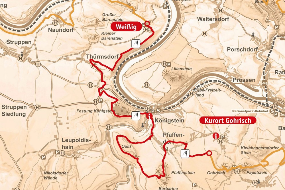 На посещение знаменитой горной крепости стоит запланировать два дополнительных часа. После этого нужно дойти до деревни Тюрмсдорф. С часовни открывается великолепный вид на крепость Кёнигштайн. После этого путь лежит на открытой местности по краям полей до деревни Вайссиг.